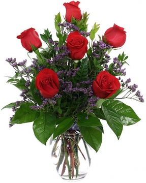 Fallegar Rauðar Rósir m/grænu og fjólubláu. ( Kort er innifalið í verði )